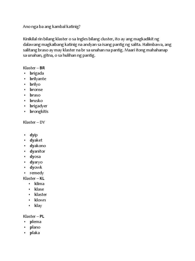 Ilan sa mga halimbawa nito ay blusa blangko bloke krus globo plato klima pluma klaster kristal klase preso. Kard Nars Relaks Indeks 8. Ngayon ay alam niyo na ang Kambal katinig o klaster at kung saan ito maaaring matagpuan.