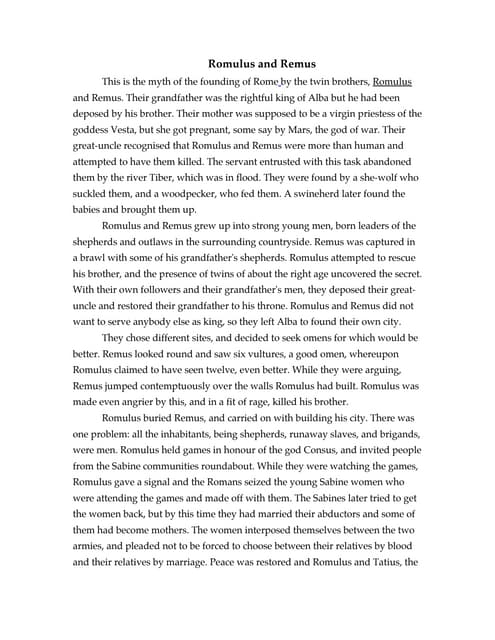 Isang Lating prinsesa ang nagngangalang Rhea ang hinuli ng kanyang masamang tiyuhin upang hindi siya manganak. We use your LinkedIn profile and activity data to personalize ads and to show you more relevant ads. Habang mga sanggol pa lamang inilagay sila sa isang basket at ipinaanod sa Tiber River ng kanilang amain sa takot na angkinin ng kambal ang kaniyang trono.