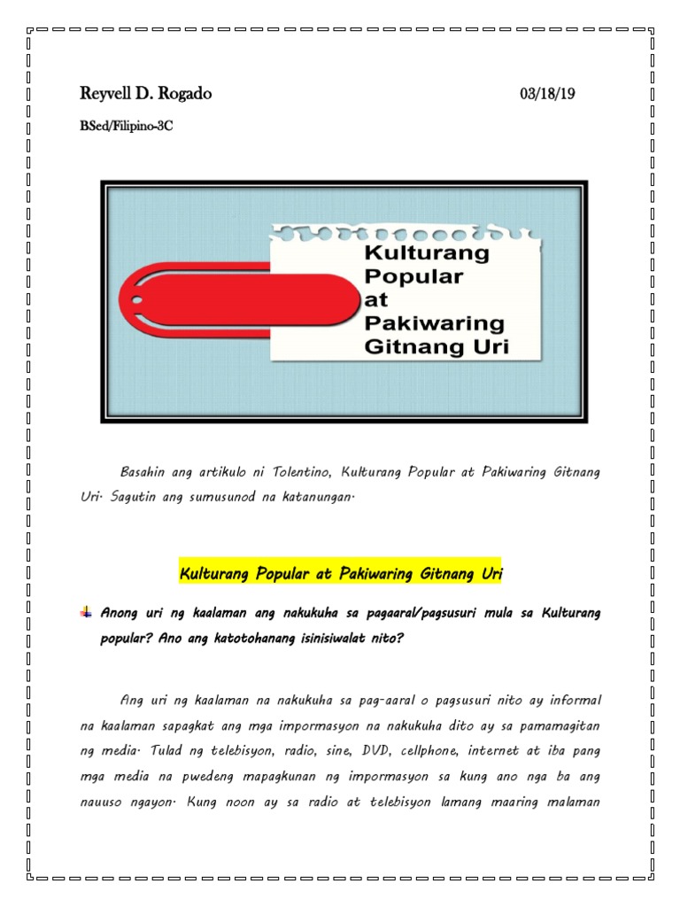 Pangkat Ii Kulturang Popular At Pakiwaring Gitnang Uri Kulturang Popular Ito Ay Course Hero